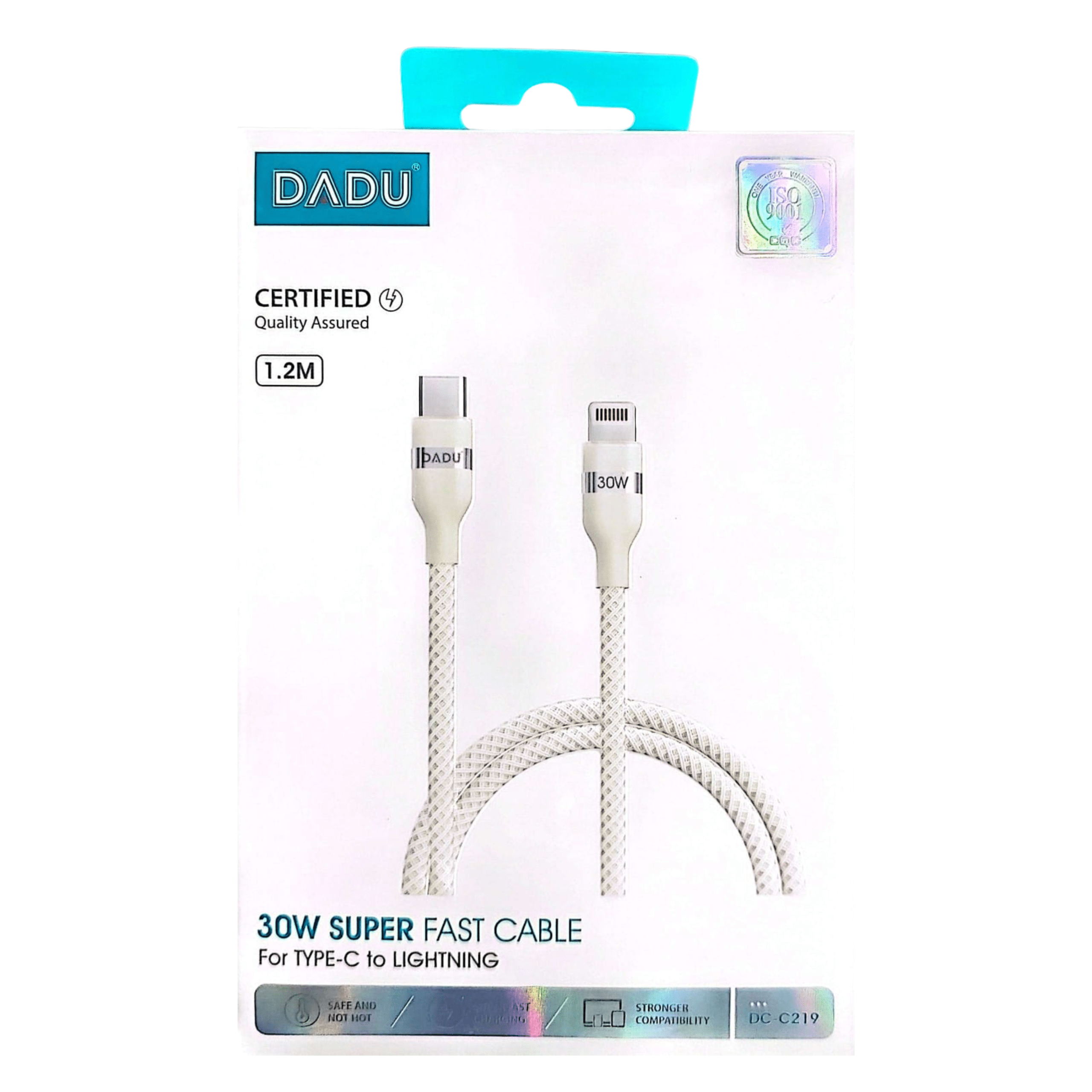 Optimiza tu carga con el cable DADU, diseñado en aleación de aluminio para una máxima durabilidad y disipación de calor. Gracias a su interfaz Tipo-C a Lightninig y su capacidad de 30W, es ideal para cargar rápidamente smartphones, tablets y laptops compatibles. Sus 120 cm de longitud ofrecen el alcance perfecto para cualquier entorno de trabajo o descanso.