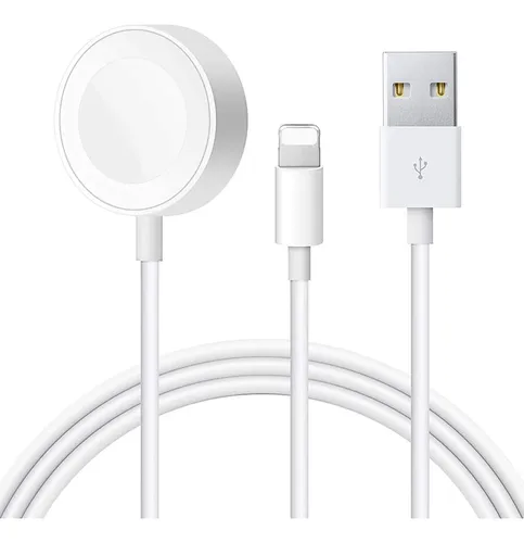 Cable cargador USB 2 en 1 para Apple Watch y dispositivos con puerto 8 pin. Carga tu Apple Watch gracias a su función de carga por inducción donde más lo necesites y, simultáneamente, tu dispositivo Apple con puerto de carga 8pin conectando este cable a un puerto USB o cargador compatible (no incluido). La base integra un imán para mantener el dispositivo estable durante toda la carga.