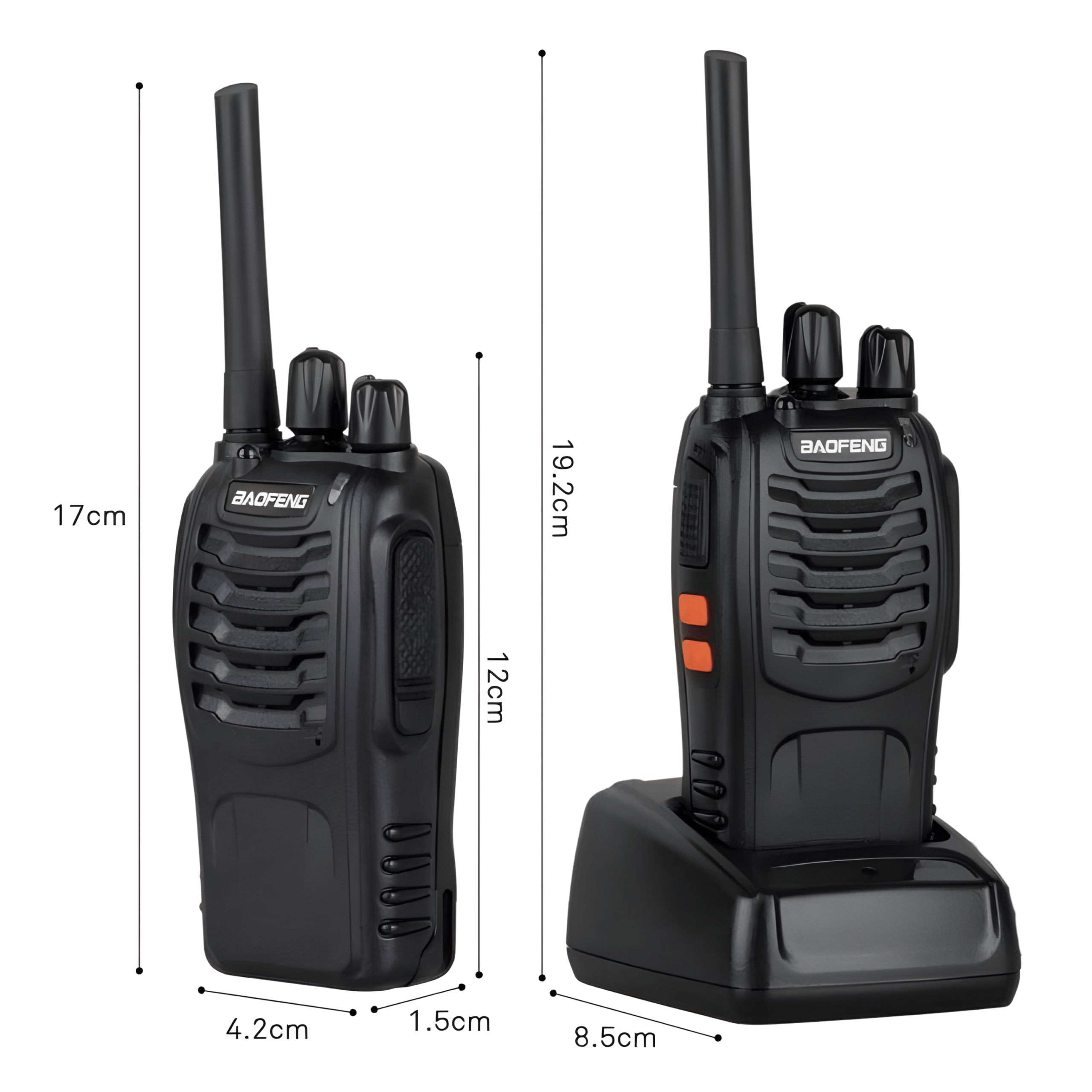 El BF-888S ofrece un rendimiento estable gracias a sus funciones avanzadas, como silenciador analógico y digital, activación por voz, alarma de emergencia, ahorro de energía y bloqueo de canal ocupado. Con un alcance de hasta 1.9–3.1 millas en áreas abiertas y cobertura aproximada de 1–30 pisos en edificios, garantiza una comunicación efectiva en distintos escenarios.