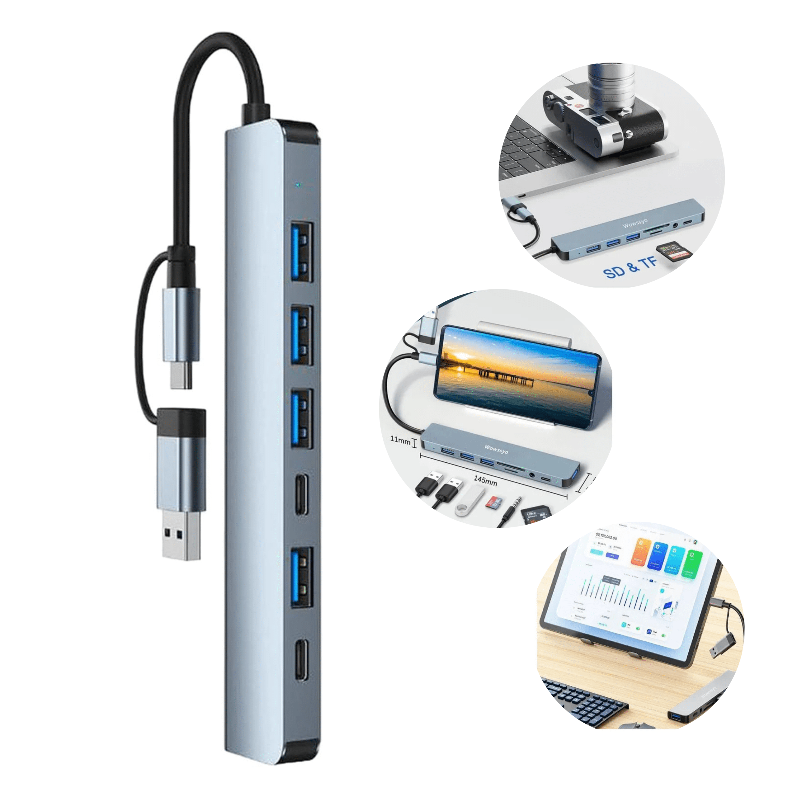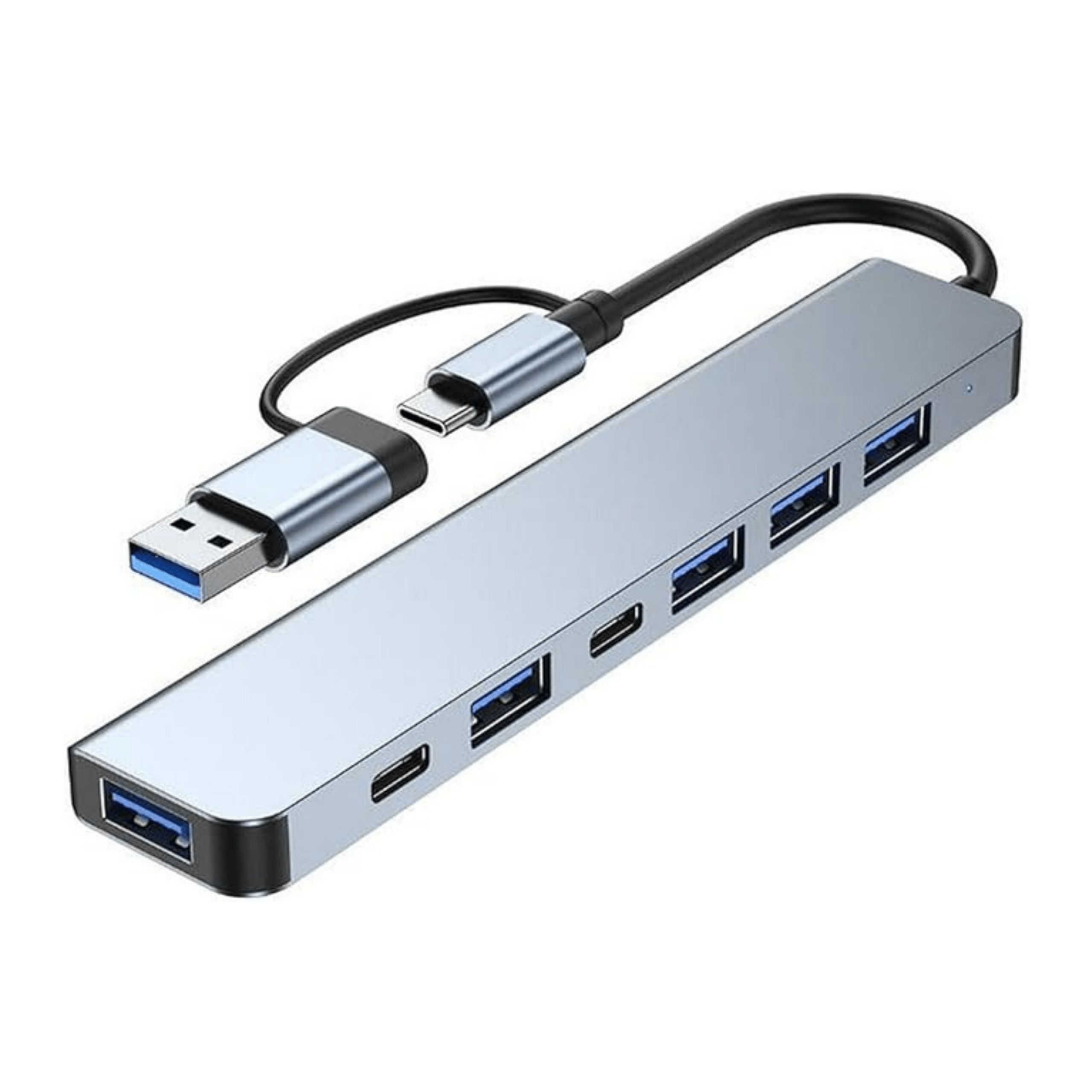 Este concentrador USB Tipo C de 8 puertos combina practicidad y rendimiento en un diseño compacto con doble cabezal USB-C y USB-A. Permite ampliar al instante las conexiones de tu tablet, laptop o smartphone, ofreciendo puertos USB 3.0 y 2.0 para integrar teclado, mouse, memorias USB y otros periféricos.